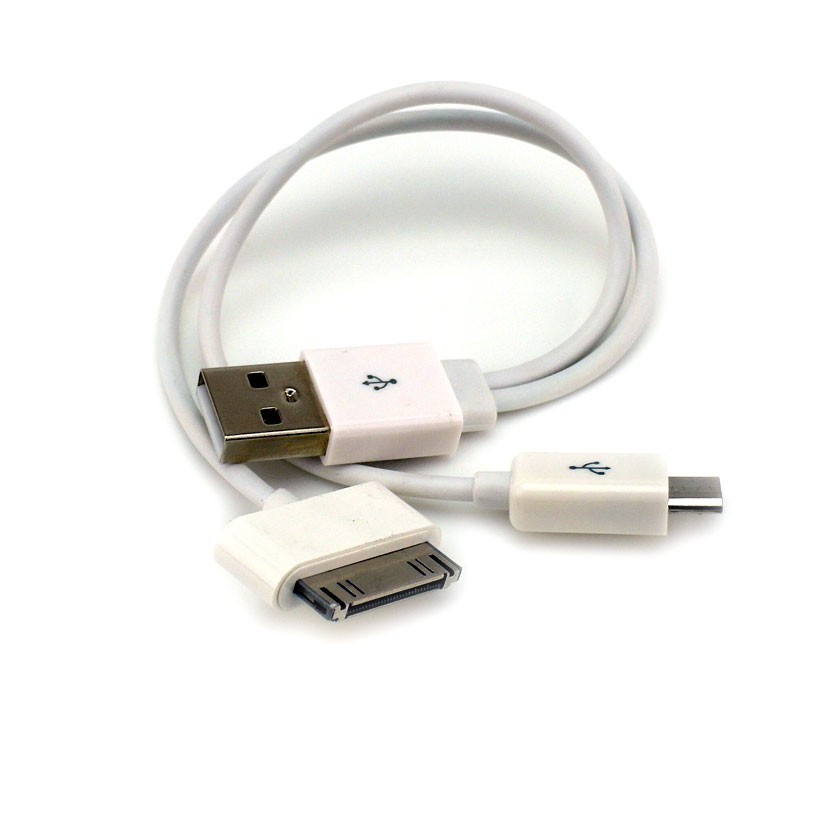 - rodzaj kabla / przejściówki: męski (wtyk) USB -> męski micro-USB + męskie 30-pinowe złącze Apple,
