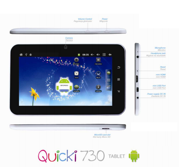 Tablet Apollo Quicki 730-W napędzany jest niezbyt wydajnym jak na dzisiejsze standardy procesorem Boxchip A10, który taktuje z częstotliwością 1,2 GHz. Dodajmy, że jest to układ jednordzeniowy. Nieco archaiczna jest również rozdzielczość ekranu, która wynosi 800 x 480 pikseli, co nawet na małym, siedmiocalowym ekranie nie zapewnia ostrego obrazu.